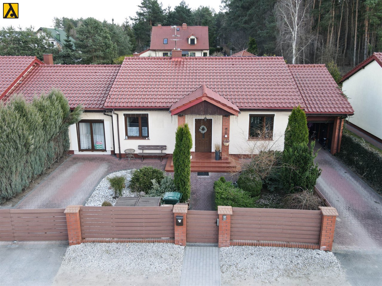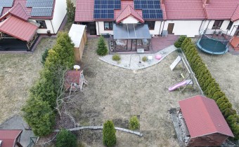 Dach pokryty dachówką ceramiczną, na dachu znajdują się panele fotowoltaiczne 10 kW. Woda i kanalizacja – sieć gminna. Działka jest ogrodzona, dwie bramy wjazdowe sterowane automatycznie, wideodomofon. Ogród zagospodarowany, z nawadnianiem automatycznym.