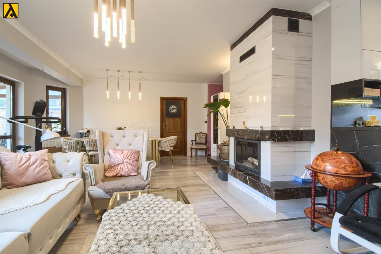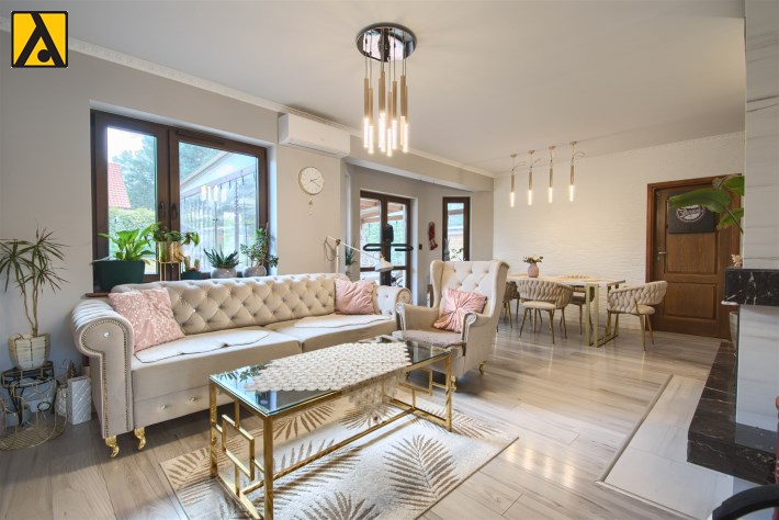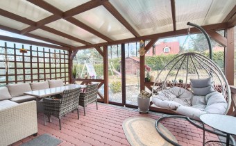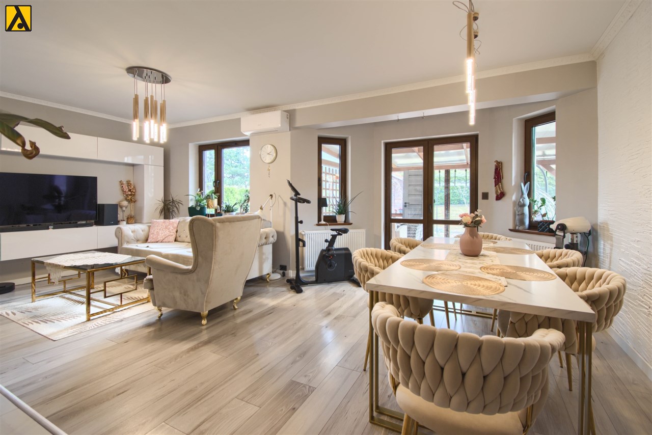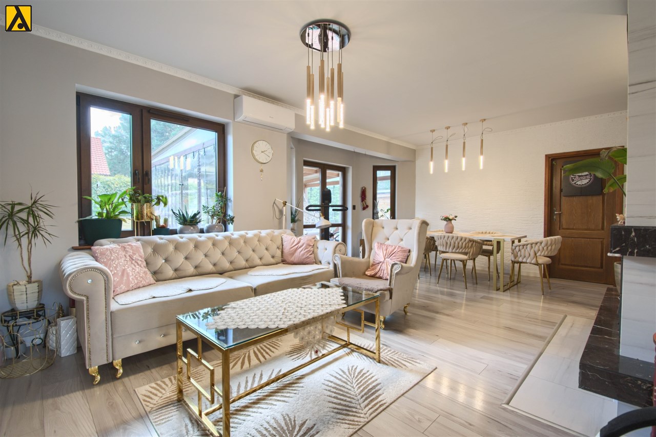 Po wejściu do domu mamy wygodny przedpokój z pomieszczeniem gospodarczym,, które aktualnie pełni rolę garderoby. Dalej mijamy łazienkę oraz dwie sypialnie i przechodzimy do najważniejszej części domu, to duży salon z jadalnią i otwartą nowoczesną kuchnią. Salon jest klimatyzowany. W centralnej części salonu znajduje się efektowny kominek. Z salonu przejście do ogrodu zimowego, z którego mamy widok na ogród. Kuchnia jest wyposażona w zmywarkę „60” Whirlpool, zabudowany piekarnik Amica, mikrofalę Beko i płytę indukcyjną Whirlpool. Dalej z salonu mamy wejście do kolejnej, dużej sypialni. W oknach rolety automatyczne, sterowane radiowo oraz moskitiery.