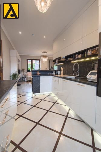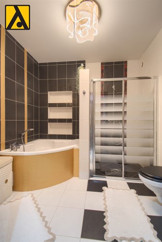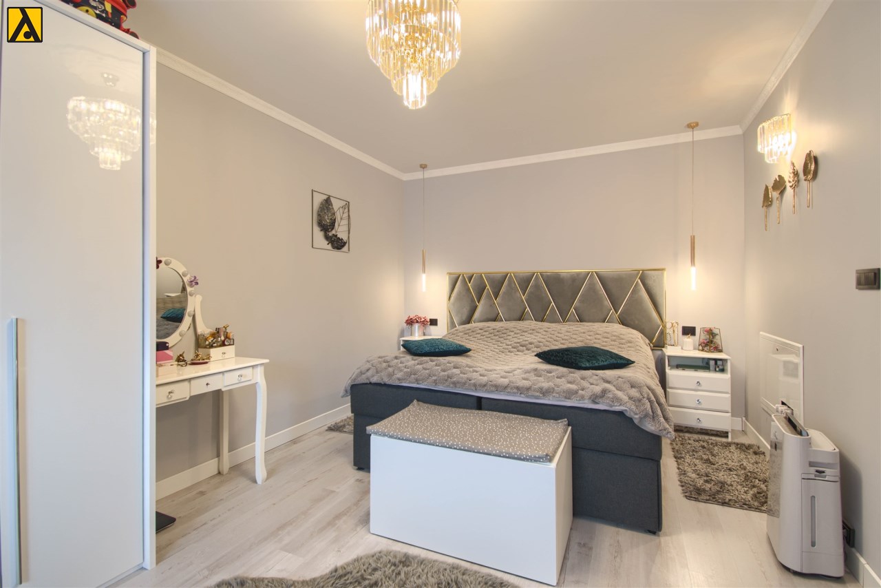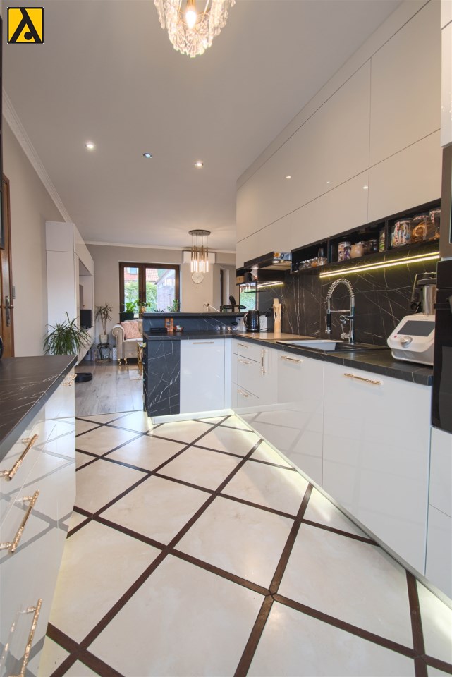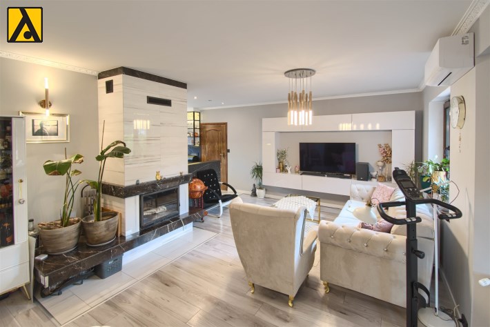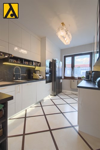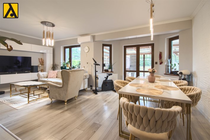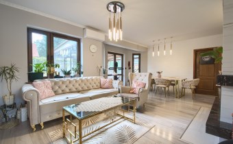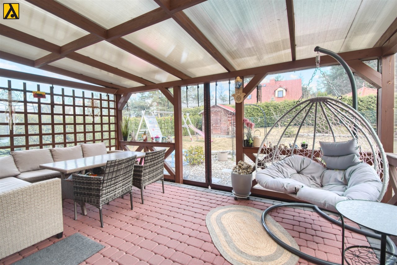 Po wejściu do domu mamy wygodny przedpokój z pomieszczeniem gospodarczym,, które aktualnie pełni rolę garderoby. Dalej mijamy łazienkę oraz dwie sypialnie i przechodzimy do najważniejszej części domu, to duży salon z jadalnią i otwartą nowoczesną kuchnią. Salon jest klimatyzowany. W centralnej części salonu znajduje się efektowny kominek. Z salonu przejście do ogrodu zimowego, z którego mamy widok na ogród. Kuchnia jest wyposażona w zmywarkę „60” Whirlpool, zabudowany piekarnik Amica, mikrofalę Beko i płytę indukcyjną Whirlpool. Dalej z salonu mamy wejście do kolejnej, dużej sypialni. W oknach rolety automatyczne, sterowane radiowo oraz moskitiery.