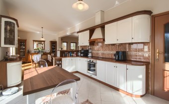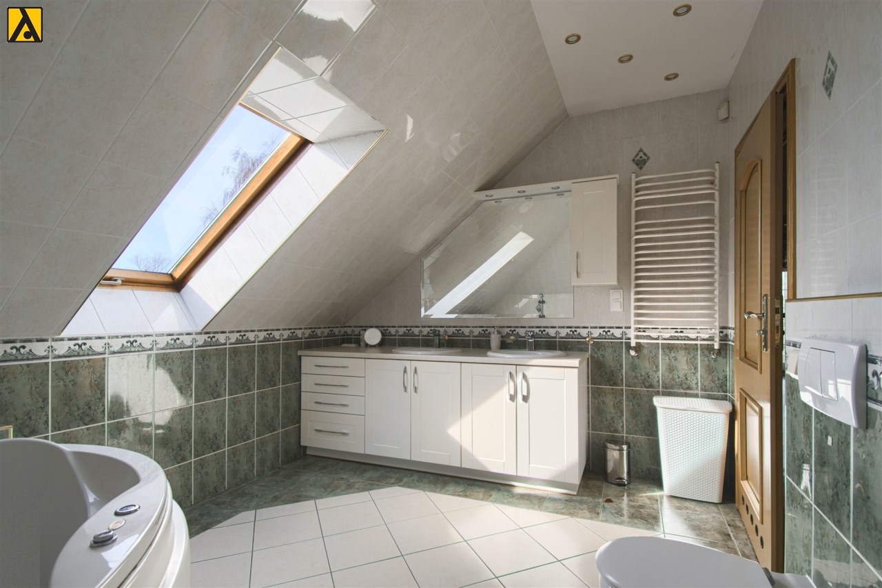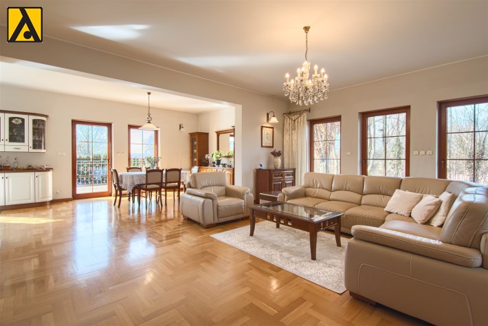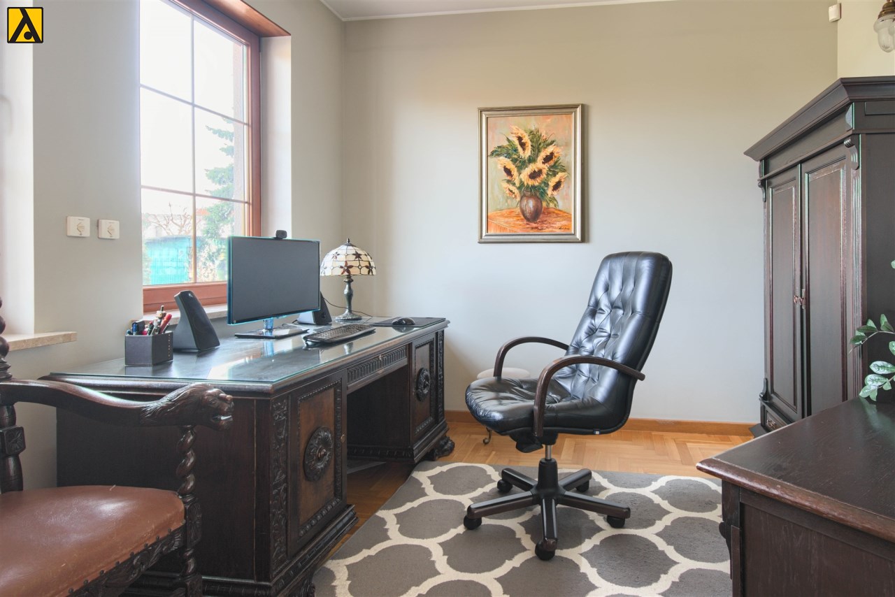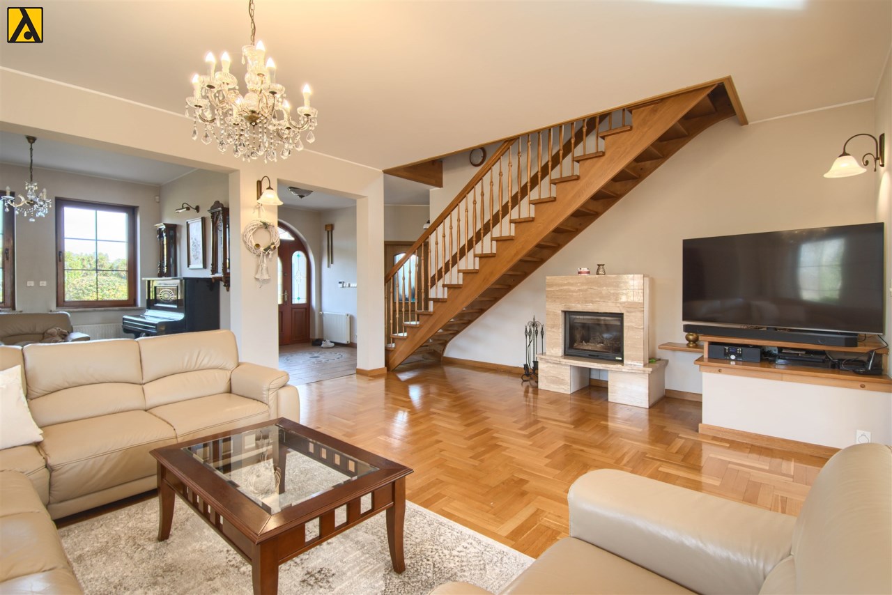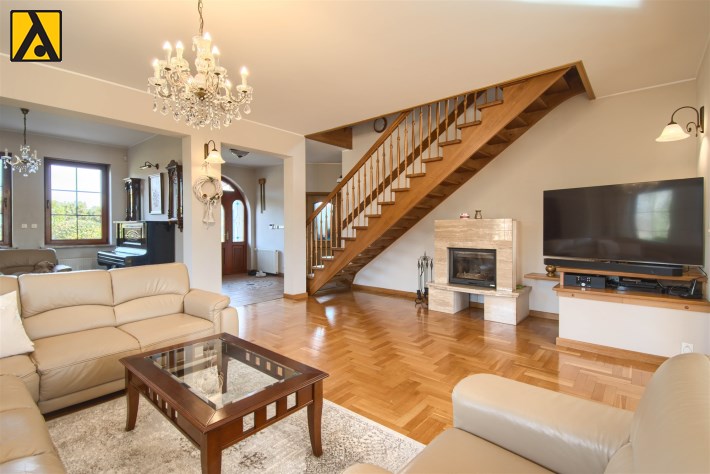 Wygodna, stylowa kuchnia otwarta na salon z jadalnią i dużym salonem, o łącznej powierzchni ok 74m2. W salonie znajduje się kominek. Z salonu wyjście na duży salon z widokiem na bardzo ładnie zagospodarowany ogród z oczkiem wodnym. Z przestronnego hallu mamy wejście do gabinetu, dużej łazienki i pomieszczenia gospodarczego, na piętro prowadzą drewniane, zadbane schody. Na piętrze znajdują się 4 wygodne sypialnie (19,5m2, 10m2, 15,5m2, 37,2m2), duża rodzinna łazienka i garderoba. Dom jest podpiwniczony, łączna powierzchnia podpiwniczenia to 160m2.