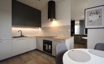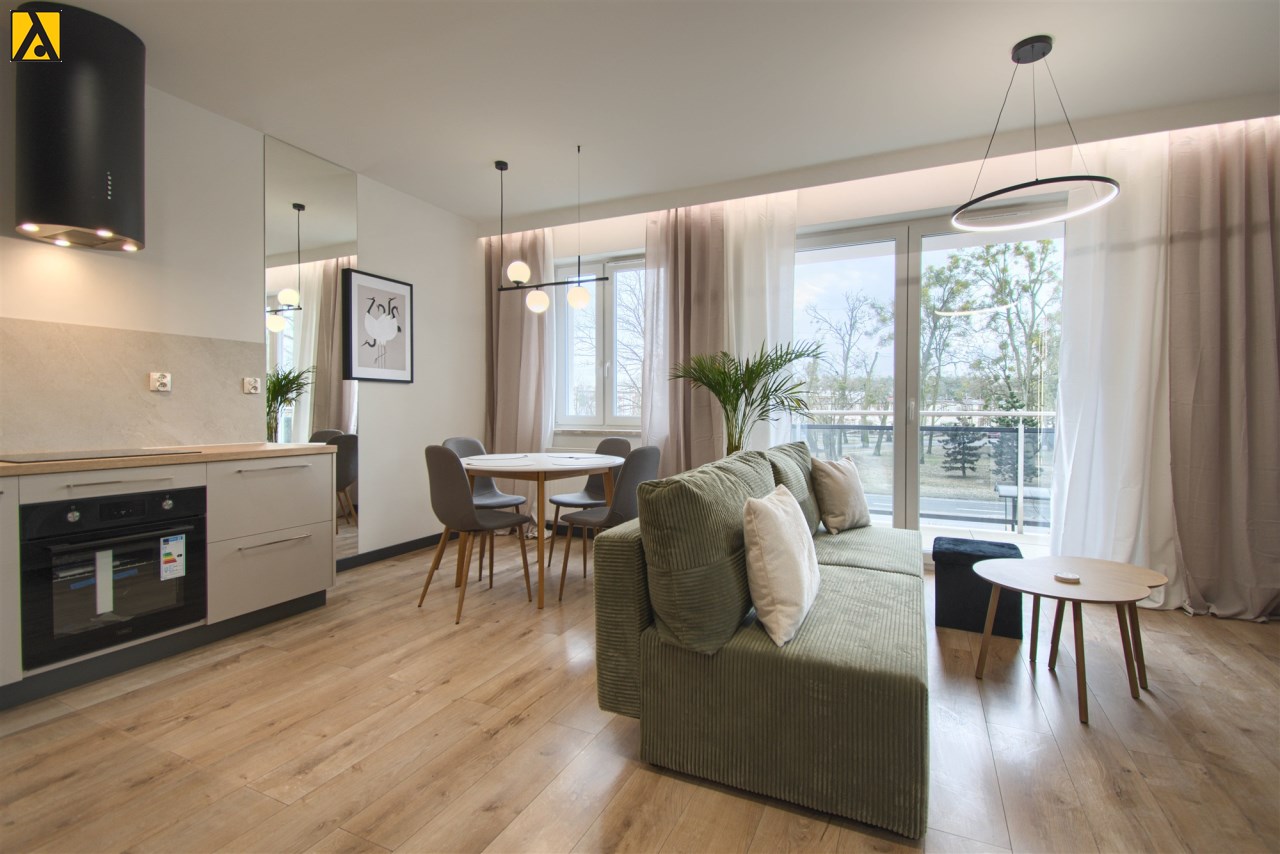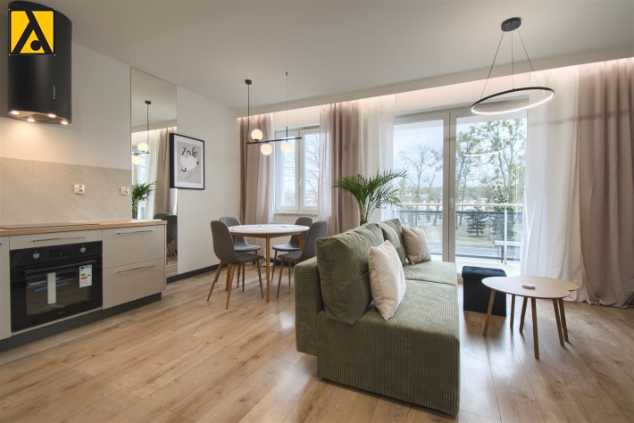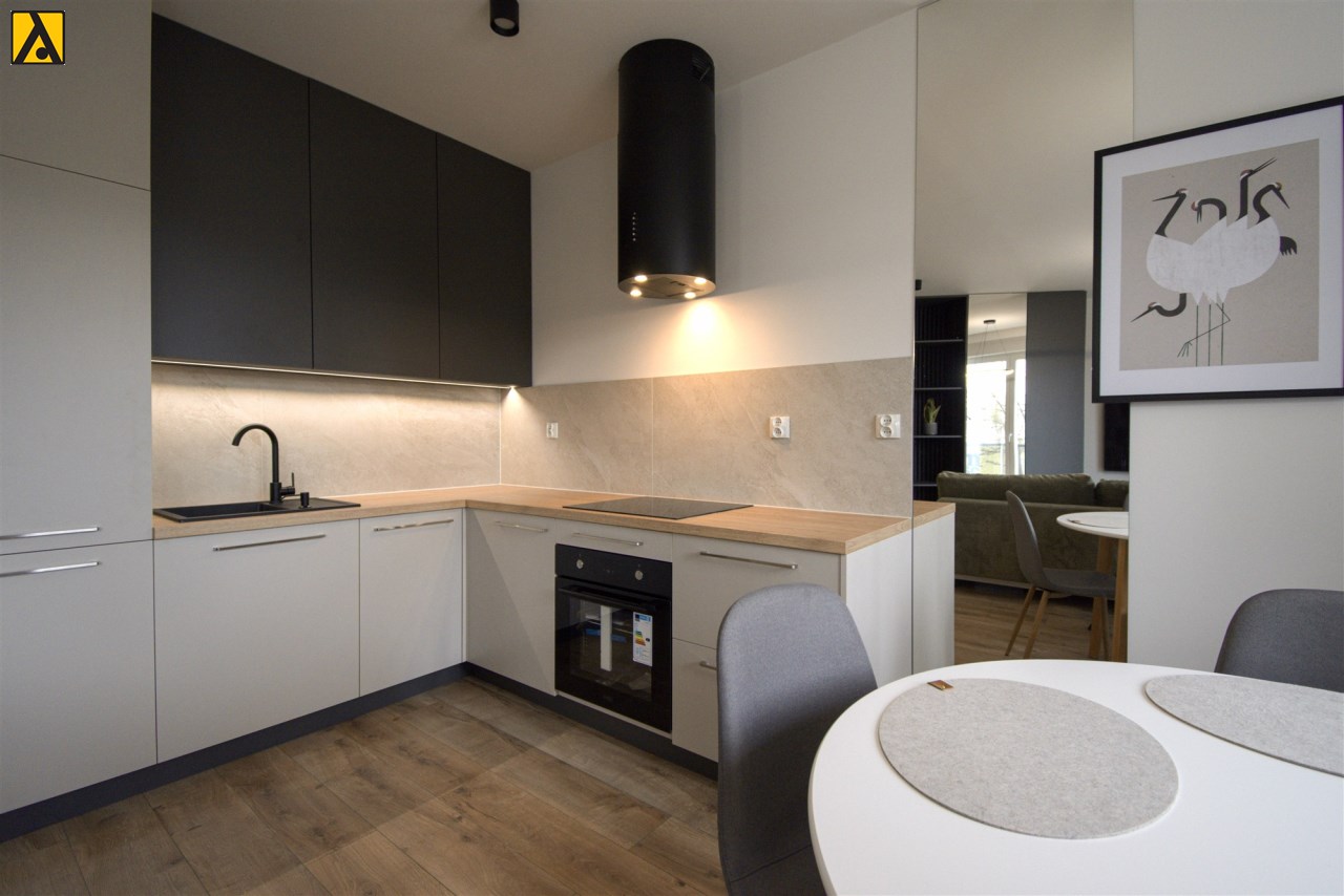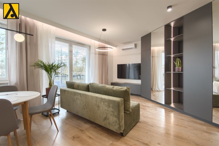 Mieszkanie składa się z przestronnego pokoju z aneksem kuchennym, przedpokoju oraz wygodnej łazienki. Z pokoju jest wyjście na duży balkon. Mieszkanie wyposażone w przestronną zabudowę kuchenną z dużą lodówką, piekarnikiem elektrycznym, płytą indukcyjną, zmywarką, nowoczesnym okapem, większość sprzętów firmy Kernau. W mieszkaniu znajduje się stół z krzesłami, wygodna rozkładana kanapa, stoliki kawowe, komoda pod TV, telewizor 60 cali – Samsung, klimatyzacja, duża zabudowa meblowa z nowoczesnym oświetleniem. W łazience kabina prysznicowa oraz duża zabudowa z pralką i miejscem na przechowywanie.