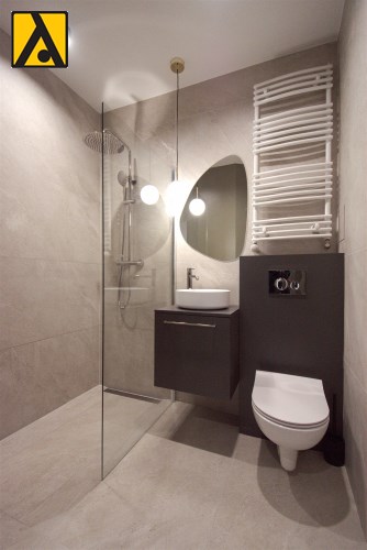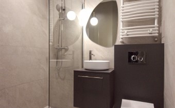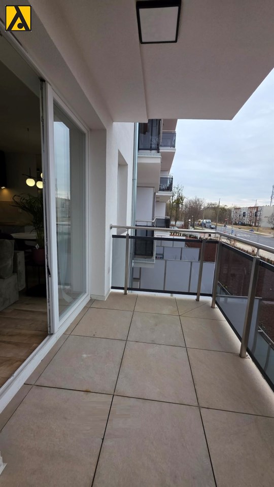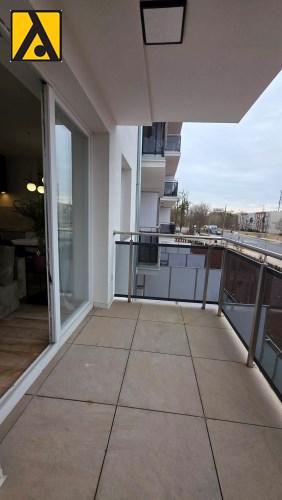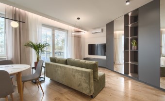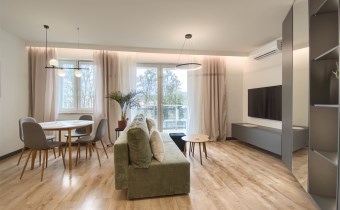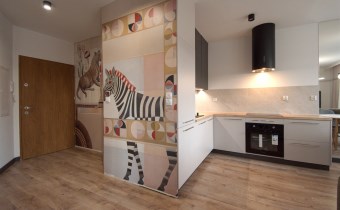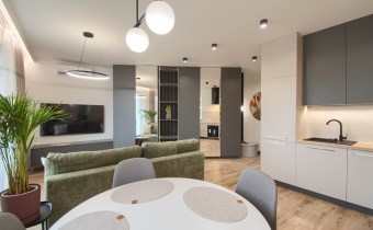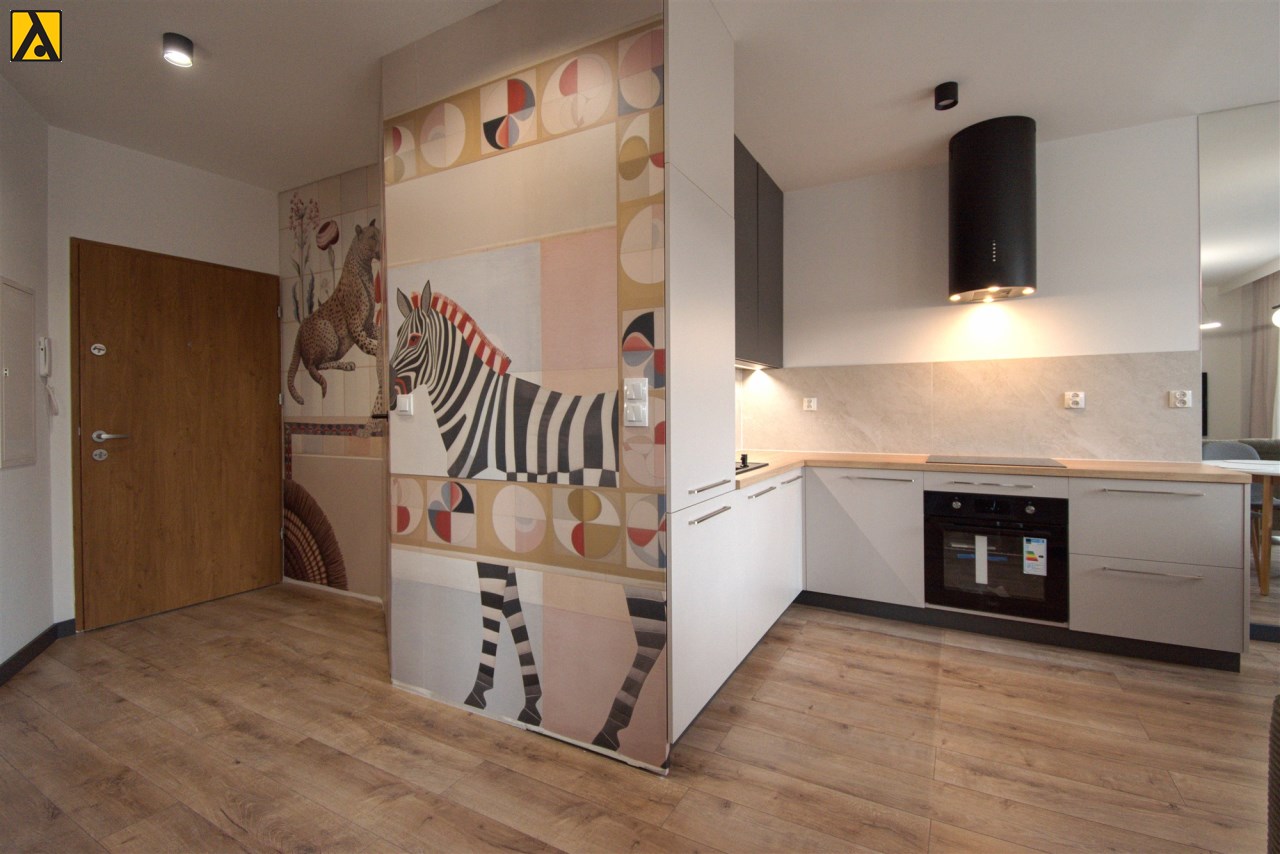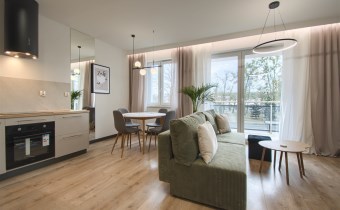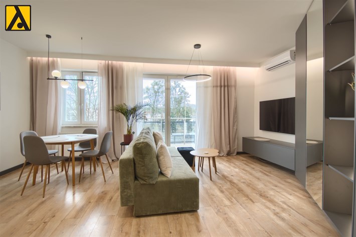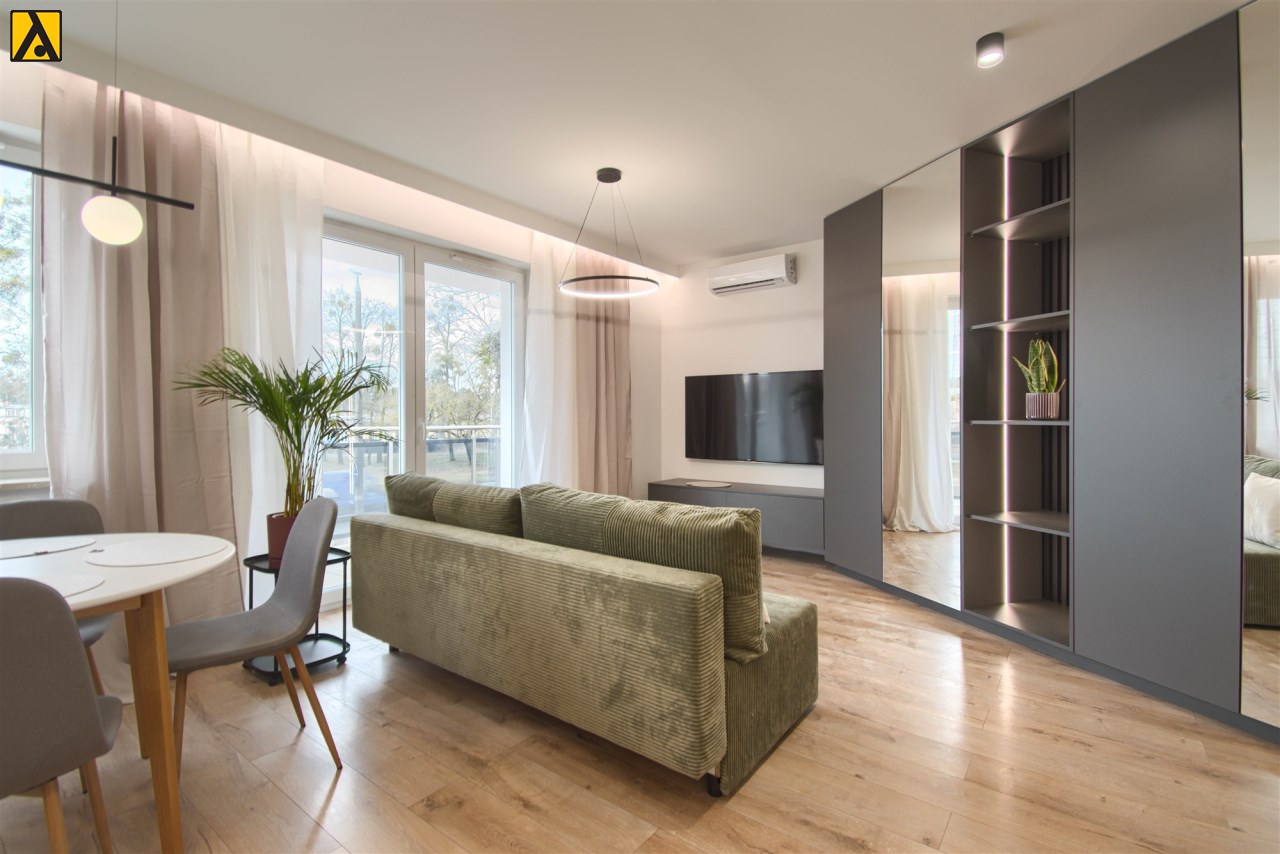 Mieszkanie składa się z przestronnego pokoju z aneksem kuchennym, przedpokoju oraz wygodnej łazienki. Z pokoju jest wyjście na duży balkon. Mieszkanie wyposażone w przestronną zabudowę kuchenną z dużą lodówką, piekarnikiem elektrycznym, płytą indukcyjną, zmywarką, nowoczesnym okapem, większość sprzętów firmy Kernau. W mieszkaniu znajduje się stół z krzesłami, wygodna rozkładana kanapa, stoliki kawowe, komoda pod TV, telewizor 60 cali – Samsung, klimatyzacja, duża zabudowa meblowa z nowoczesnym oświetleniem. W łazience kabina prysznicowa oraz duża zabudowa z pralką i miejscem na przechowywanie.