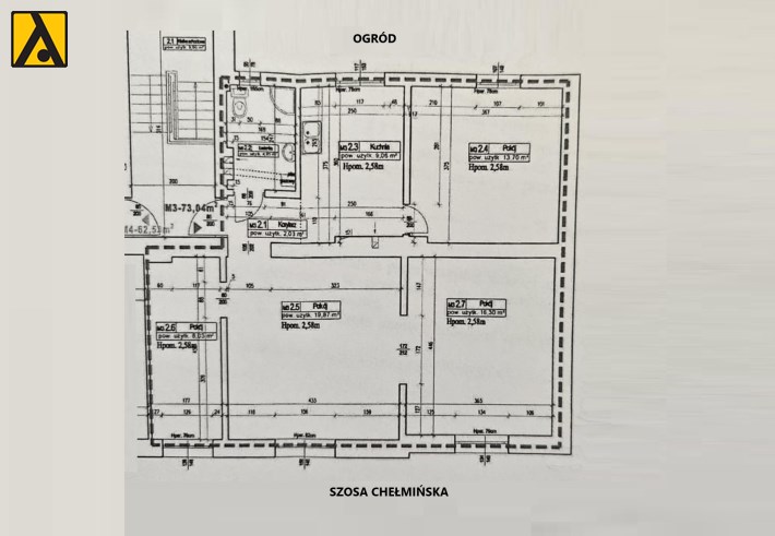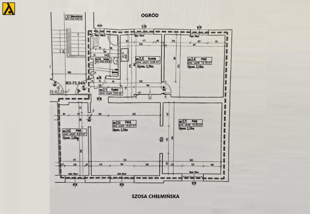 Na sprzedaż mieszkanie położone na ostatnim, pierwszym piętrze w budynku wielorodzinnym przy ul. Szosa Chełmińska. Mieszkanie składa się z czterech pokoi, oddzielnej kuchni, dużej łazienki i korytarza. Powierzchnia 73,04m2: Pokoje - 19,87m2, 16,30m2, 13,70m2, 8,03m2; Kuchnia - 9,06m2; Łazienka - 4,05m2.