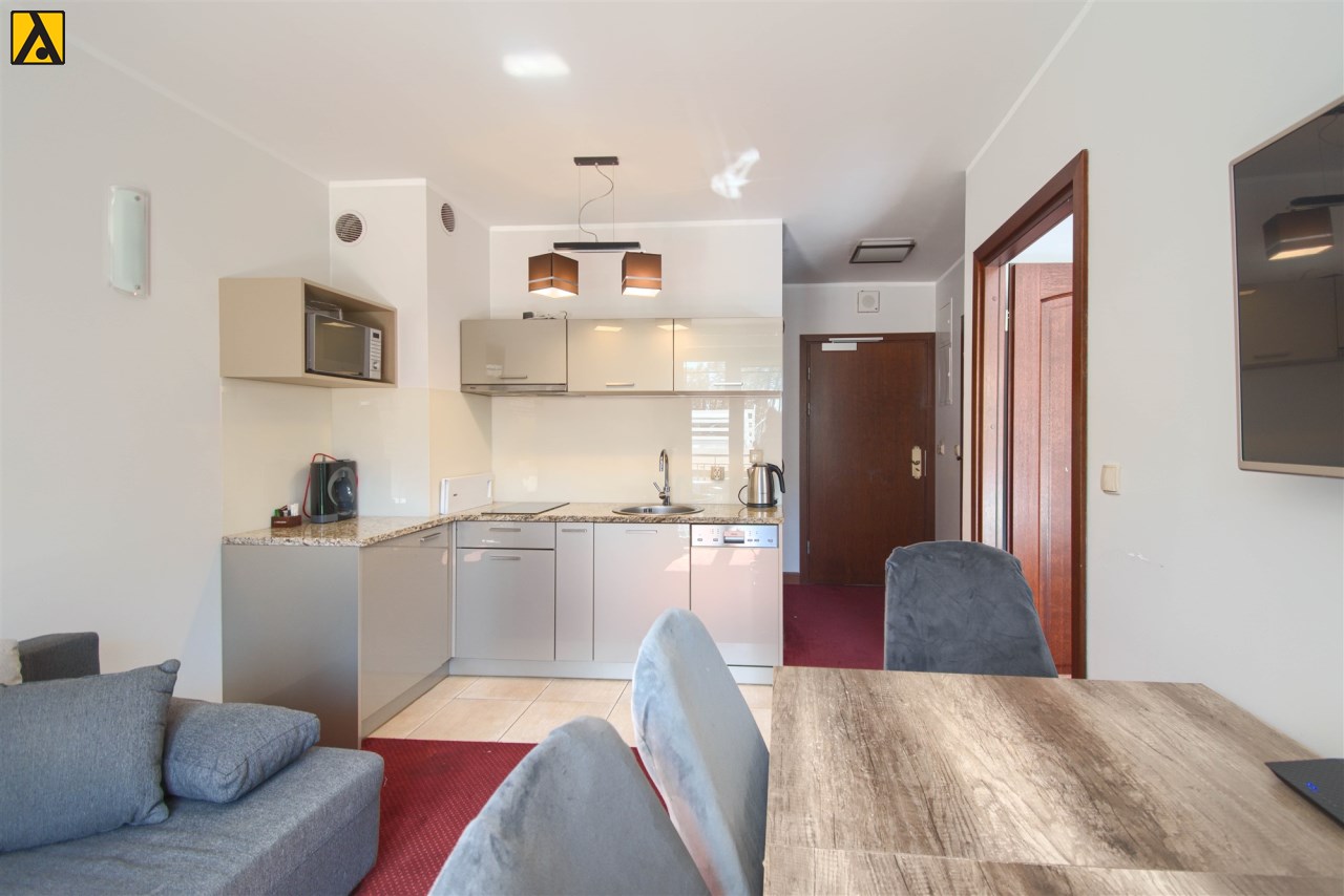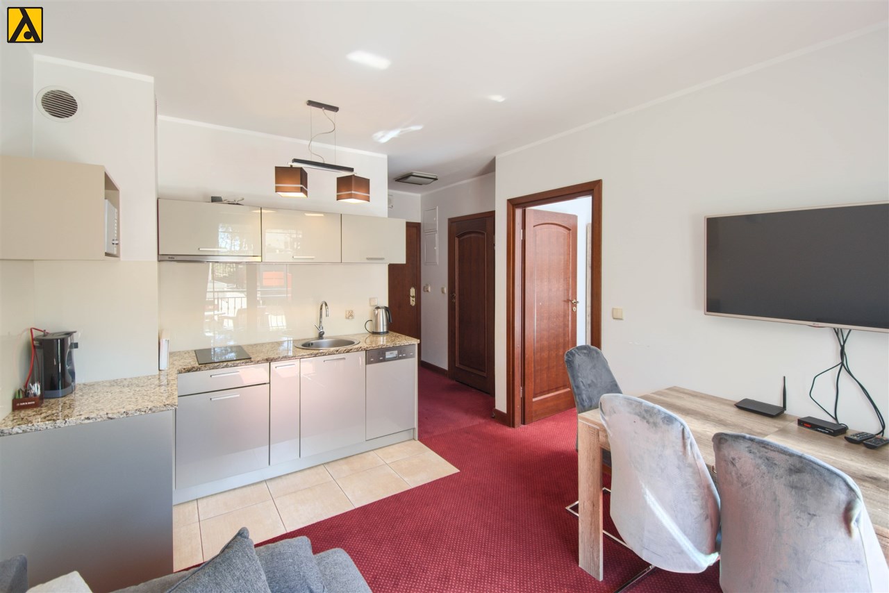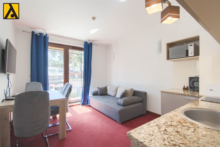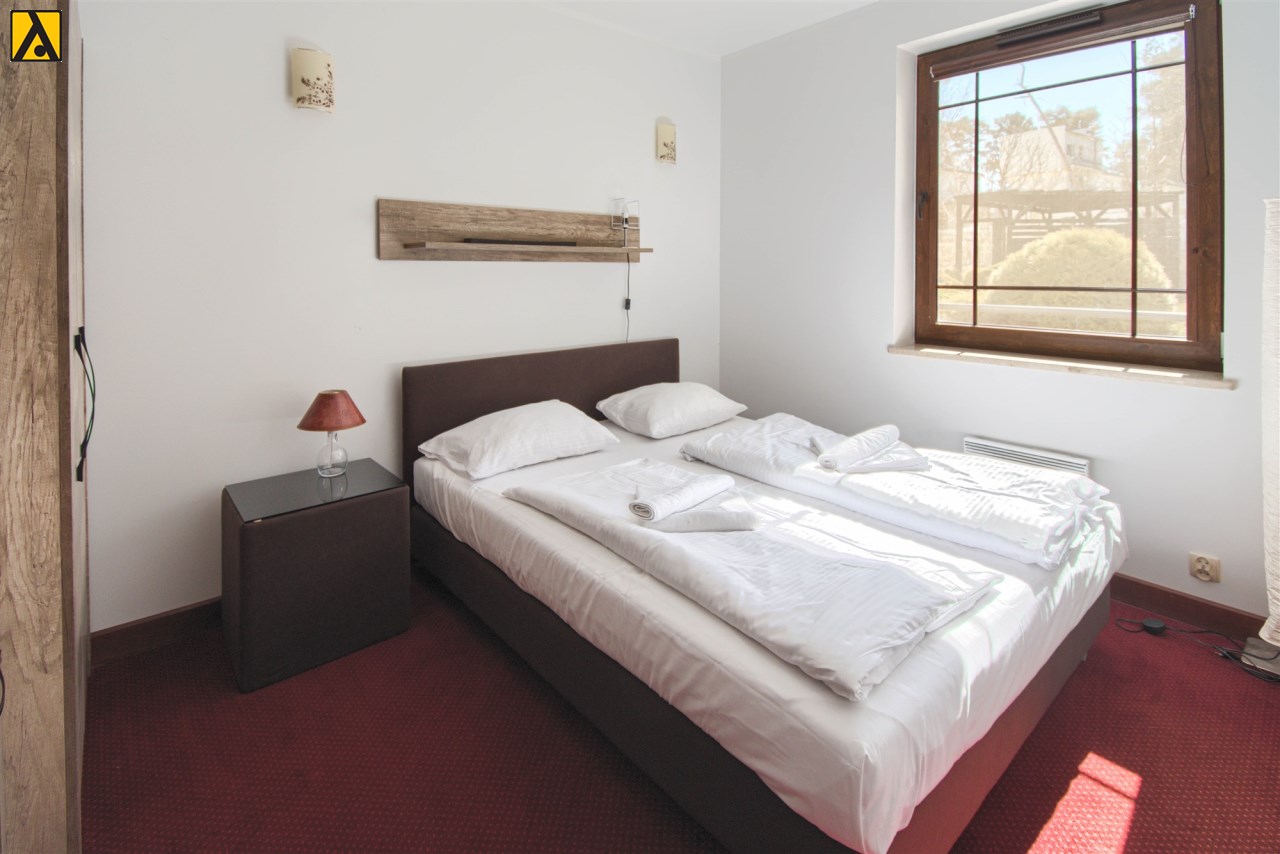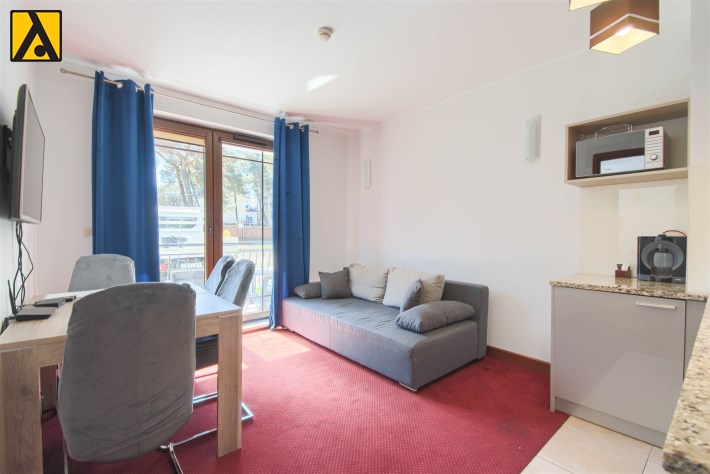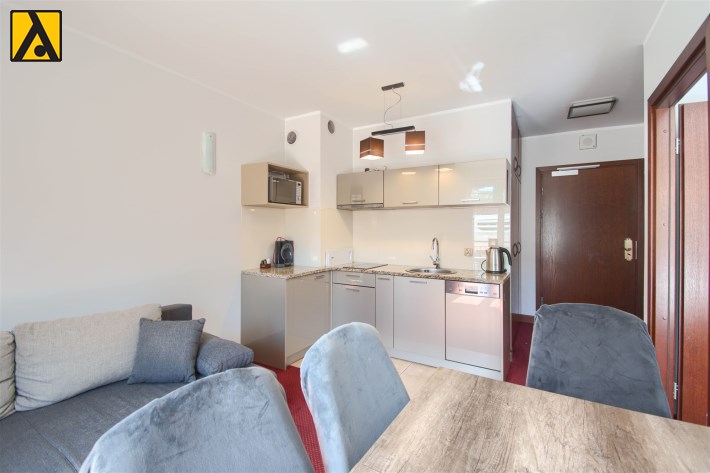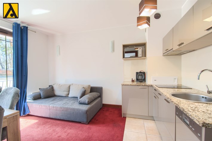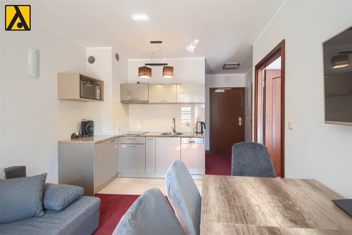 wyjście na duży balkon/taras. W łazience kabina prysznicowa, pralka. W sypialni znajduje się duża szafa, duże łóżko z materacem. W przedpokoju duża zabudowana szafa. Lokal wyposażony w naczynia, pościel i ręczniki, żelazko, czajnik elektryczny. Do tej pory wynajmowany w systemie najmu krótkoterminowego prowadzonego przez firmę Sun&Snow, całkowicie wyposażony i gotowy do dalszego najmu lub dla osób prywatnych.